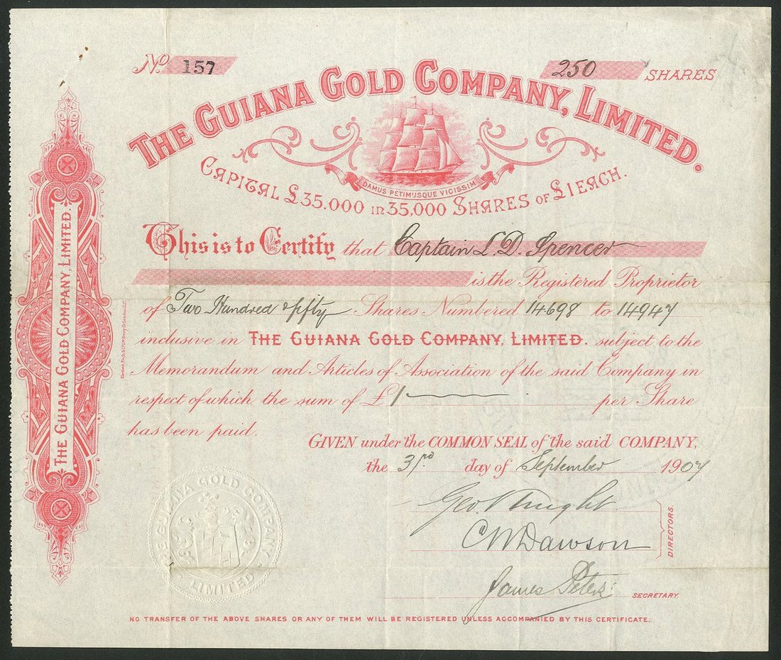 British Guiana: Guiana Gold Company Limited, £1 shares, 19[07], #157, sailing ship top centre as in the colony's coat of arms, red. Formed in 1903 to take over the mining operations of the British Guiana Explorations Syndicate Ltd. VF.