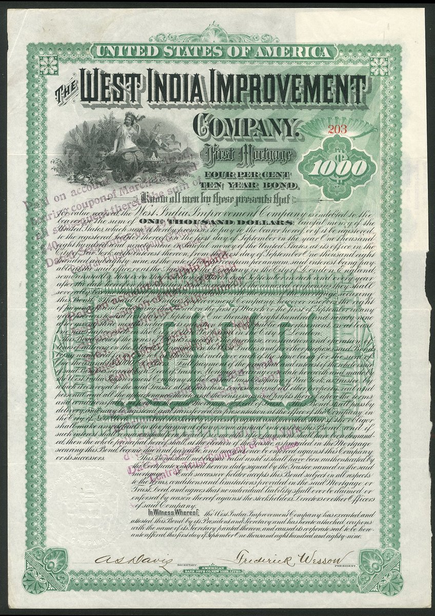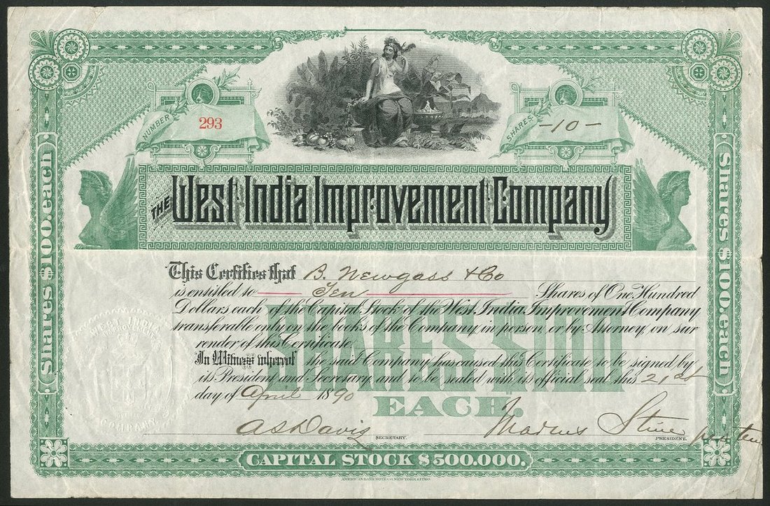 Jamaica: West India Improvement Company, $100 shares, 18[90], #293, allegorical figure, green and black, together with a First Mortgage 4% 10-Year bond, $1000, 1889, #203, allegorical figure top left, green and black, both ABNCo., with coupons. Formed in 1889 to acquire and develope the Jamaica Railway and large tracts of land on the island. VF.