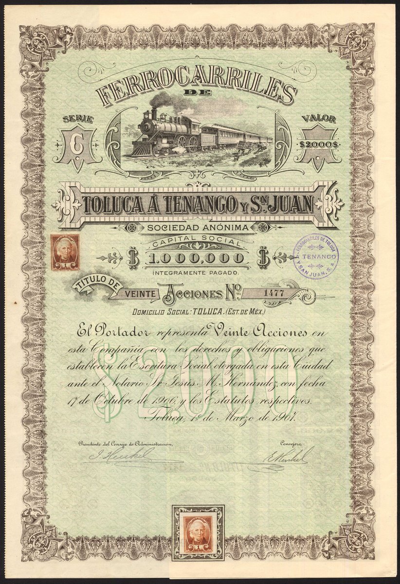 Mexico: Ferrocarriles de Toluca a Tenango y Sn. Juan S.A., 20 shares of $100, 1907, #1477, steam train at top, ornate borders, imprinted revenue stamps at bottom and centre left, brown, green underprint, with coupons. EF.