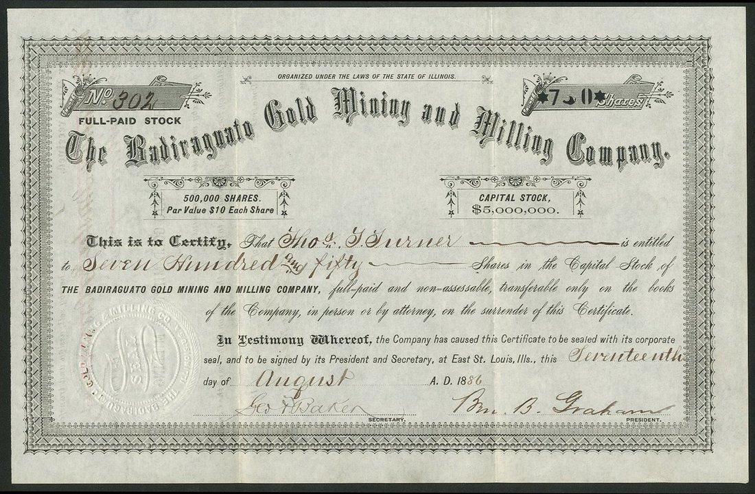 Mexico: Badiraguato Gold Mining and Milling Company, $10 shares, East St.Louis, Illinois 18[86], #302, signed by George F. Baker as Secretary, ornate border, black. George Fisher Baker (1840-1931), financier and philanthropist, made a huge fortune after the Civil War in railroads and banking and by the time of his death was said to be the third richest man in the United States. Mines in Sinaloa. AEF.
