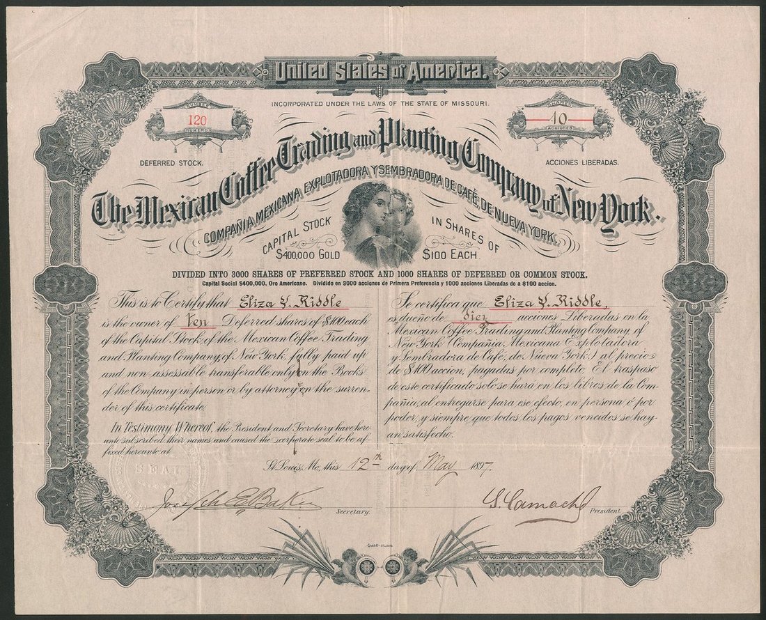 Mexico: Mexican Coffee Trading and Planting Company of New York, deferred stock of $100, St.Louis 189[7], #120, large format piece with young female heads in centre, black, pink paper, text in English and Spanish. VF.