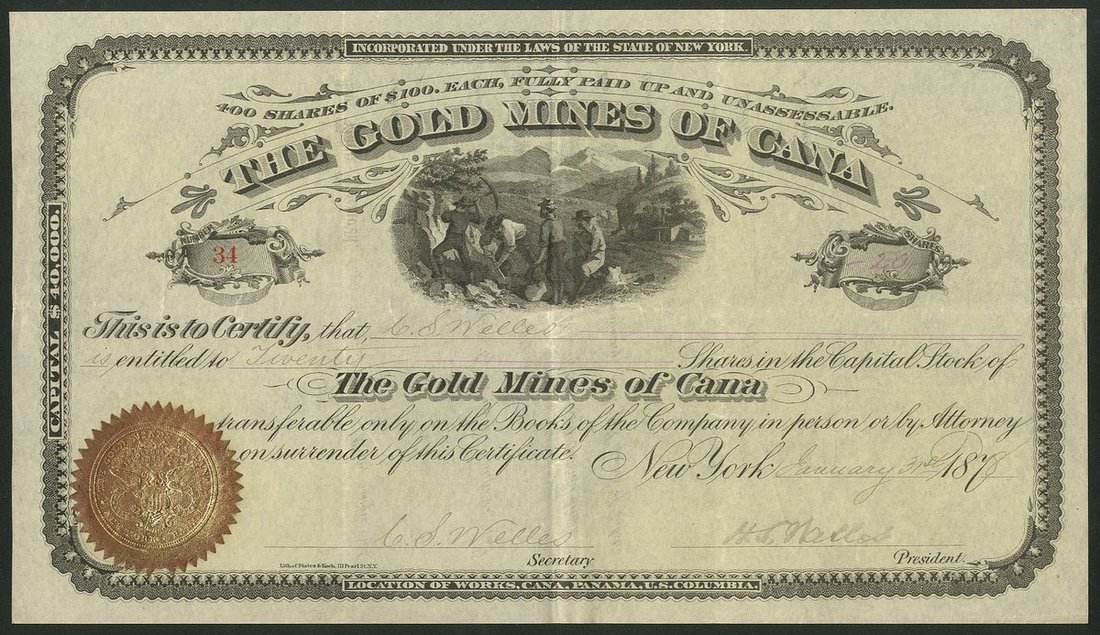 Panama/Colombia: Gold Mines of Cana, $100 shares, New York 187[8], #34, miners at work, black, gold seal. The remote area of Cana in Panama had extremely valuable gold mines during the Spanish Colonial period until they were closed in 1727 due to disease and pirate attacks. This company worked the mines again for a short time and they were productive enough for a railroad to be built connecting the mines to main routes. Closed again within a few years and swallowed up by the jungle. VF and scarce.