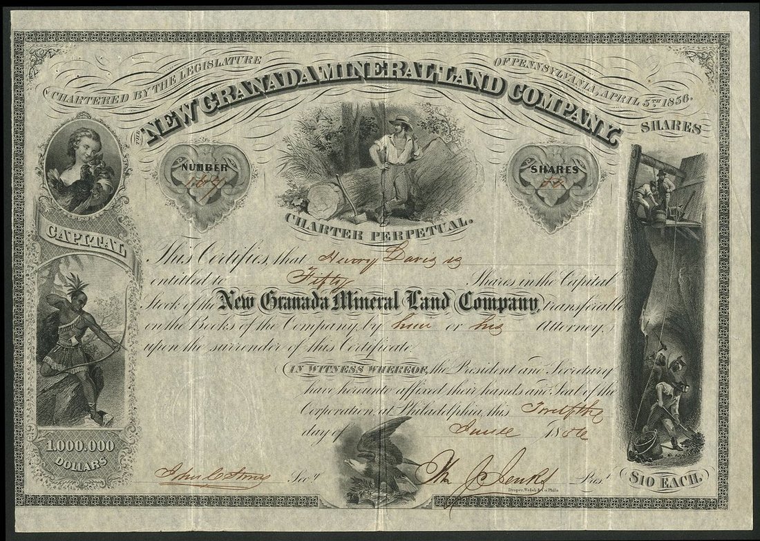Panama/Colombia/New Granada: New Granada Mineral Land Company, $10 shares, Philadelphia 18[56], #167, attractive piece with mining vignette at right, native American at left, woodsman in centre, black. Chartered in Pennsylvania to exploit the mineral resources of Varaguas Province, now Panama. Creased, AVF and scarce.
