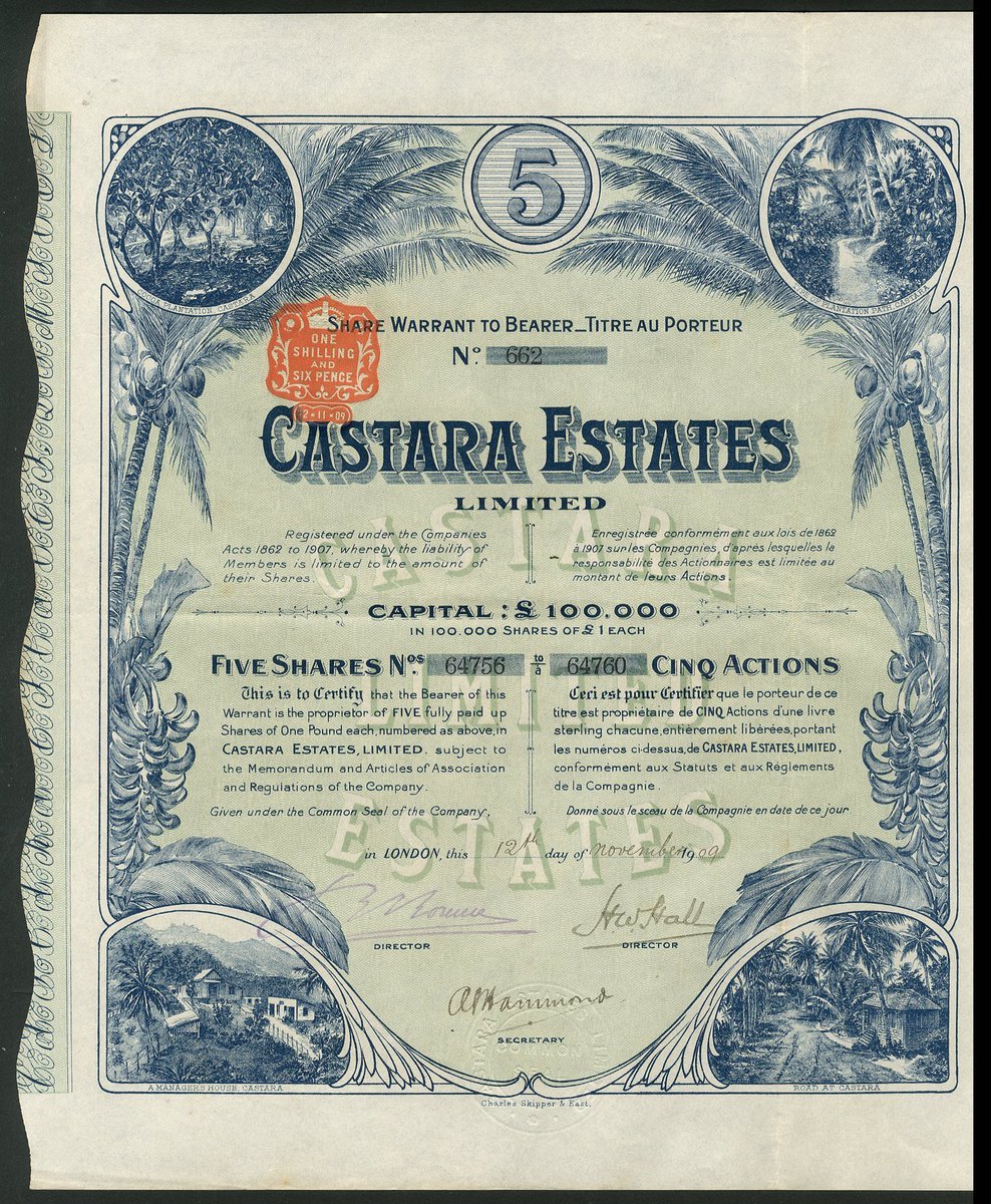 Trinidad: Castara Estates Ltd., bearer warrant for 5 shares of £1, London 19(09), #662, vignettes in each corner of cocoa plantation, palm trees either side, blue, blue underprint, with coupons. Cocoa plantation on the coast of Tobago, West Indies. VF and scarce denomination.
