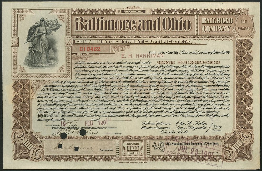 (x) U.S.A.: Baltimore and Ohio Railroad Company, common stock trust certificate, [1901], #C10462, issued to E. H. Harriman and signed by him on the reverse, allegorical figure at top left, brown and black, cancelled. E.H.Harriman (1848-1909), Railroad executive and capitalist. His early career was spent reorganising bankrupt railroads and in 1895 reorganised the Union Pacific and became its President in 1903. Fought Hill for control of the Northern Pacific resulting in the stock market panic of 1901. EF.