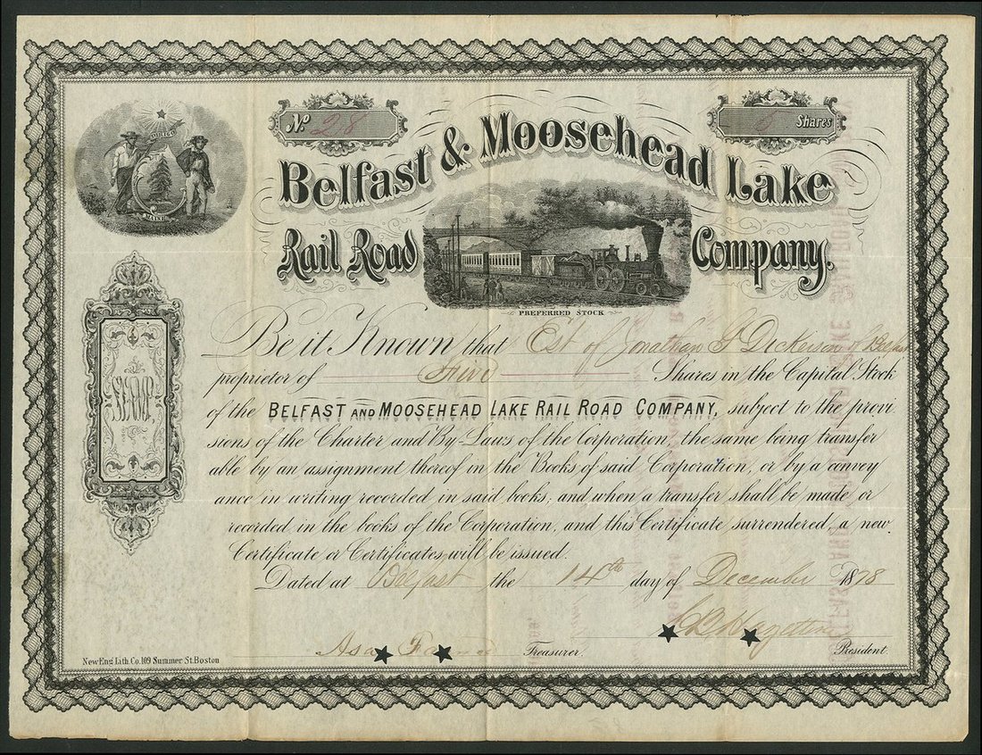 U.S.A.: Belfast & Moosehead Lake Rail Road Company, preferred stock, 18[78], #28, steam train in centre, black. Small hole cancels, VF.