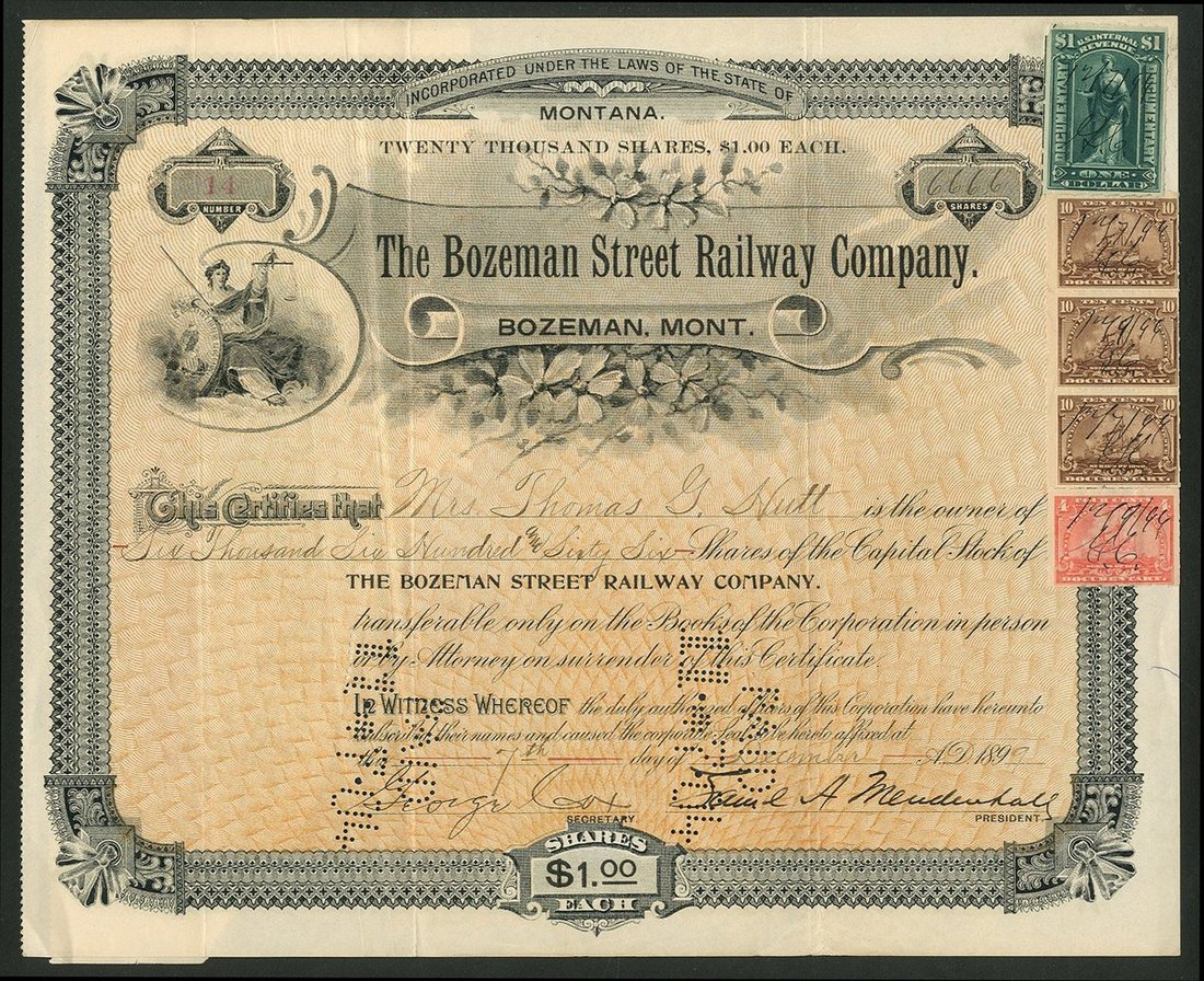 U.S.A.: Bozeman Street Railway Company, Montana, $1 shares, 189[9], #14, for 6,666 shares, one third of the entire capital, 'Justice' sits at left, black, yellow underprint, revenue stamps at right edge. Cancelled, remains of counterfoil at left, VF.