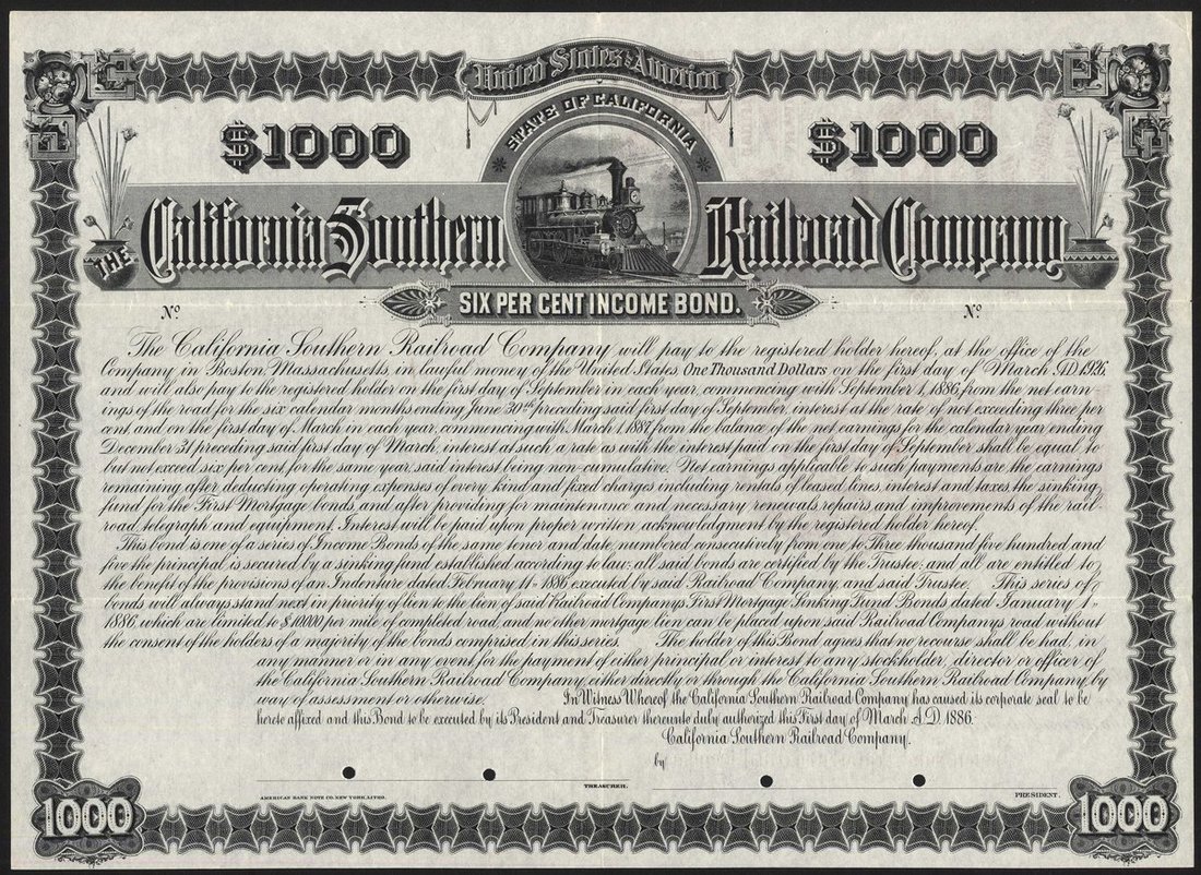 U.S.A.: California Southern Railroad Co. (CA), 6% income bond for $1000, 1886, a specimen certificate from the ABNCo. archives, steam train in centre, black, small hole cancels over signature area. GVF and rare.