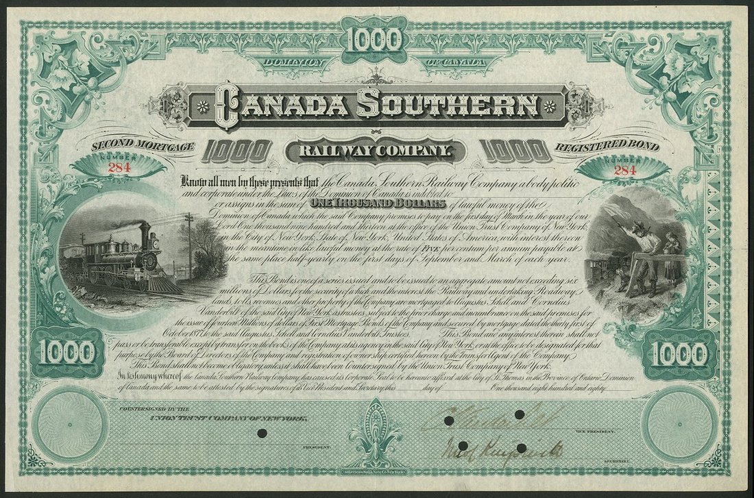 (x) U.S.A.: Canada Southern Railway Co., second mortgage registered bond for $1000, un-issued, 188[-], #284, vignette of steam engine to left and man waving flag to right, ornate border, green and black, cancelled. Signed by Cornelius Vanderbilt II (1843-1899), grandson of Commodore Cornelius Vanderbilt and head of the New York Central Railroad and others. VF.