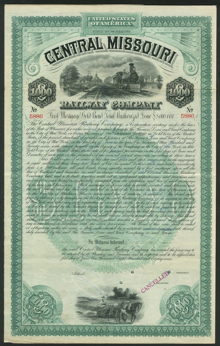 U.S.A.: Central Missouri Railway Co., First Mortgage bond for $1000, 1887, #5886, found in the ABNCo. archives so probably kept as a specimen, steam train at top, green and black, with coupons. traces of blue crayon on face, not signed and stamps CANCELLED. VF and scarce.