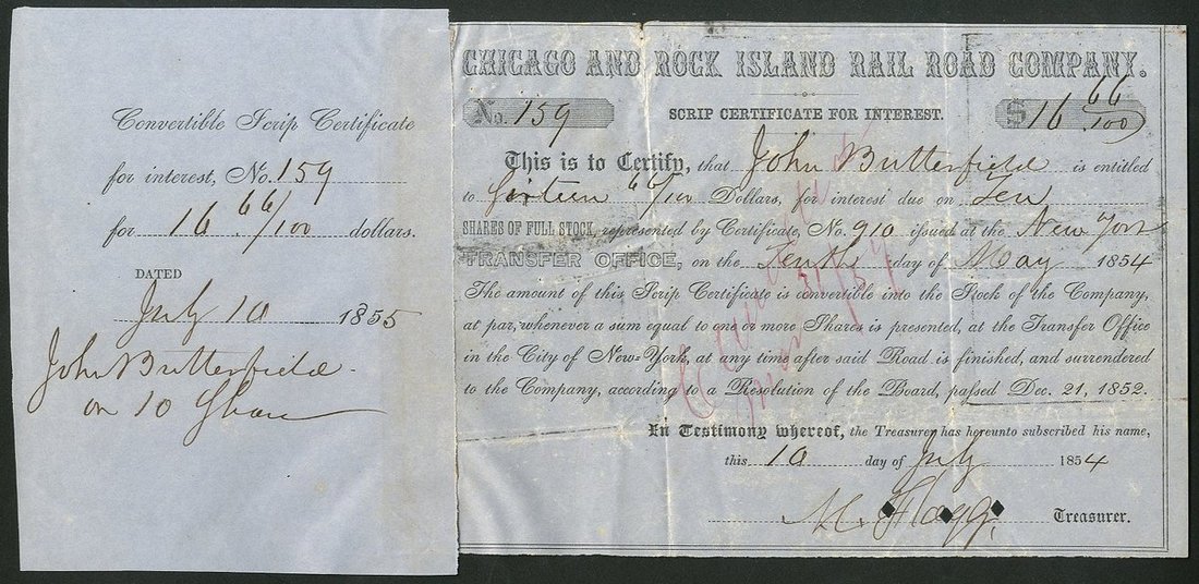(x) U.S.A.: Chicago and Rock Island Rail Road Company, scrip certificate for interest for $[16.66], 185[4], #159, issued to John Butterfield and signed by him on the reverse, black printing on blue paper, cancelled, stub reglued at left. John Butterfield (1801-1869), a transport pioneer who created the Butterfield Overland Mail Company to link California with the Eastern States. His company joined with Wells & Co., and Livingston, Fargo & Co. to form the American Express Company. F-VF and rare.