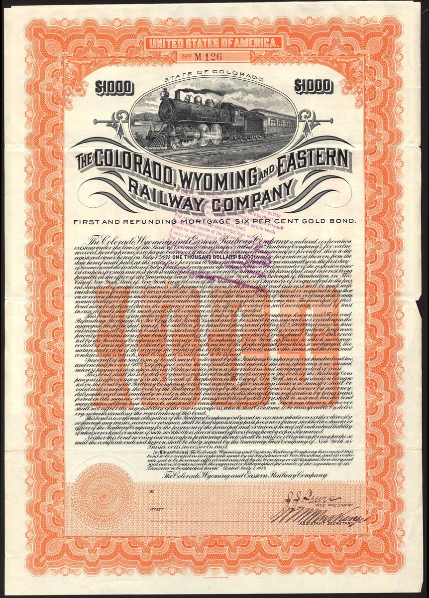 U.S.A.: Colorado, Wyoming and Eastern Railway Co. (CO), general mortgage income 6% gold bond for $1000, 1914, #M1421, steam train at top, ornate border, green and black, 1000 underprinted in green, with coupons. VF.