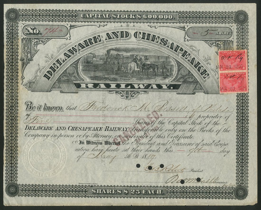 U.S.A.: Delaware and Chesapeake Railway, $25 shares, 18[89], #74, steam train with paddle steamer in background, horses and riders in foreground, black, adhesive revenue stamps. Stamped and hole cancelled. Tiny nicks at edge and glue reside at left, GVF+,