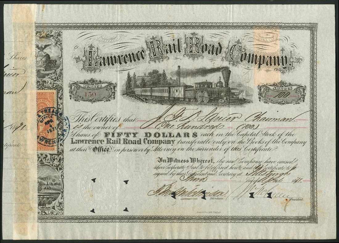 (x) U.S.A.: Lawrence Rail Road Company, $50 shares, 186[71], #150, issued to and signed on the reverse by James J.D.Lanier, steam train right, black, counterfoil reglued at left, hole cancelled. Lanier became President of the Bank of Indiana in 1833, later making considerable investments in local railroads. He later moved to New York to found Winslow, Lanier & Co., a bank and share dealer. Died in 1881. VF.