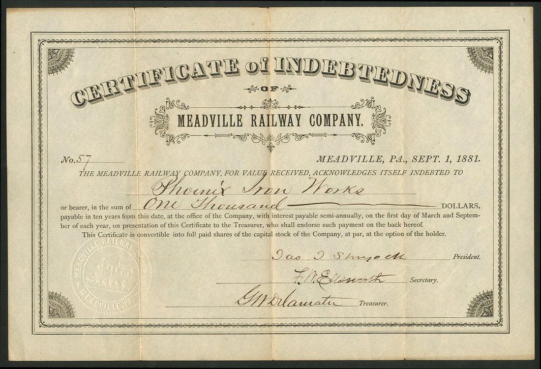U.S.A.: Meadville Railway Company (PA), certificate of indebtedness, $[1000], 1881, #57, black, ornate border, embossed seal. GVF and not in Cox.