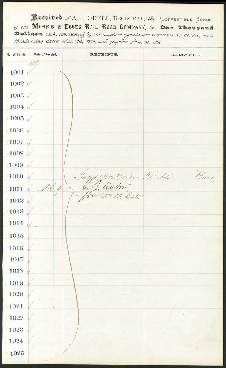 (x) U.S.A.: Morris and Essex Rail Road Company, a receipt for 25 bonds of $1000 each dated 1869, the property of William B Astor and signed by J.J.Astor on his behalf. Folio sheet showing bond numbers 1001-1025, black printing, clear signature. John Jacob Astor III (1822-1890), grandson of John Jacob Astor and son of William Backhouse Astor, lost control of the New York Central system to the Vanderbilts but concentrated on the family's vast land holdings in New York State. EF.