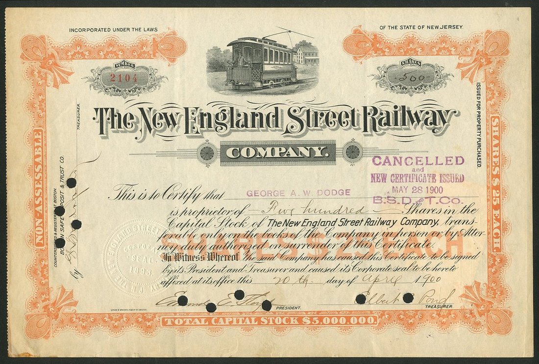 U.S.A.: New England Street Railway Company, $25 shares, 1[900], #2104, electric tramcar at top, orange and black. Hole cancelled, VF.