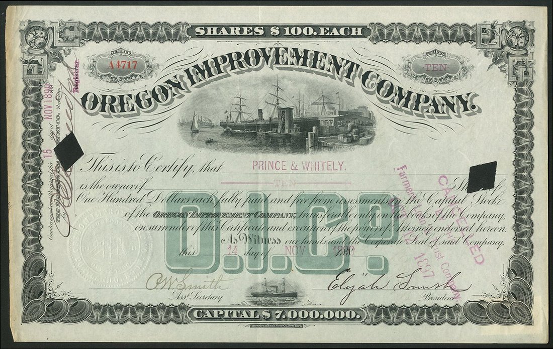 (x) U.S.A.: Oregon Improvement Company, $100 shares, 188[90], #A4717, vignette of ships at dockside below title, ornate border, black with green 'O.I.Co' in underprint, cancelled. The Oregon Improvement Company, founded by Henry Villard, purchased the Seattle & Walla Walla Railroad Co., and the Seattle Coal & Transportation Co. in 1880. VF.