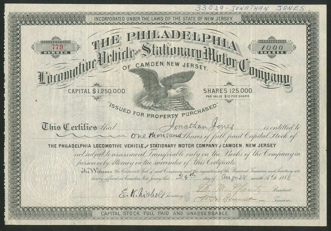 U.S.A.: Philadelphia Locomotive Vehicle and Stationary Motor Company of Camden, New Jersey, $10 shares, 188[8], #779, eagle and American shield, black. Signed by Daniel M. Pfantz of Philadelphia who had patented a spring propelled vehicle which this company purchased. VF.
