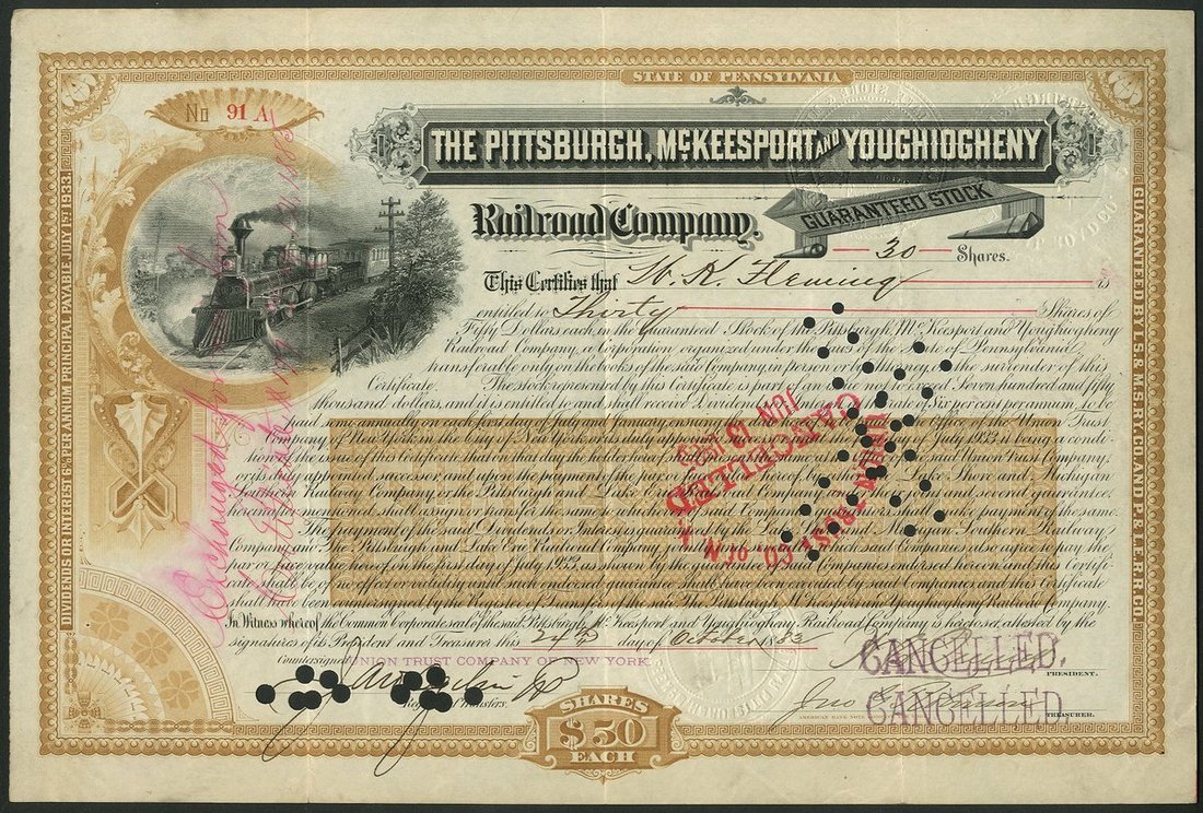 (x) U.S.A.: Pittsburgh, McKeesport and Youghiogheny Railroad Company, guaranteed stock certificate, 18[83], #91A, signed on the reverse by Frederick William Vanderbilt in his capacity as acting secretary, steam train at left, brown and black. Frederick William Vanderbilt (1856 - 1938), director of the family controlled New York Central Railroad for 61 years and also several other railroads. Grandson of Cornelius Vanderbilt and son of William Henry Vanderbilt. VF.