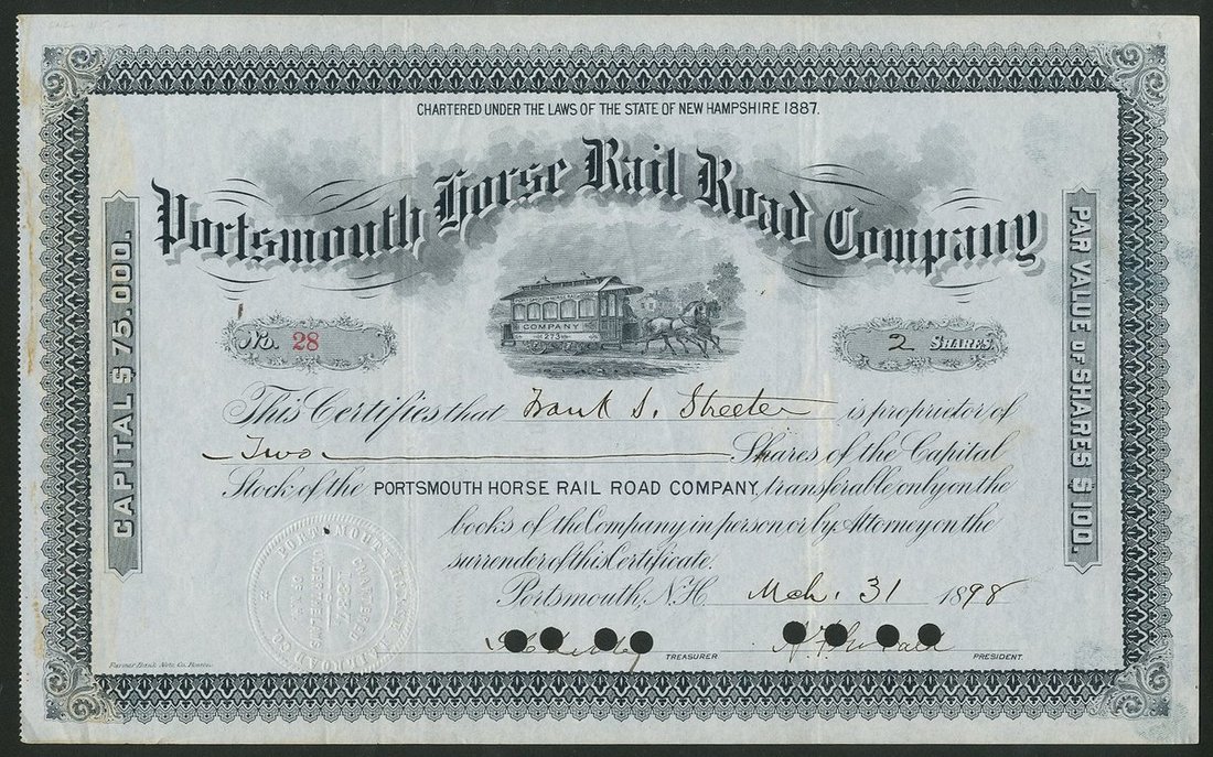 U.S.A.: Portsmouth Horse Rail Road Company, New Hampshire, $100 shares, 18[98], #28, horse trolley in centre, black on bluish paper. Hole cancelled, glue residue at left, VF and scarce.