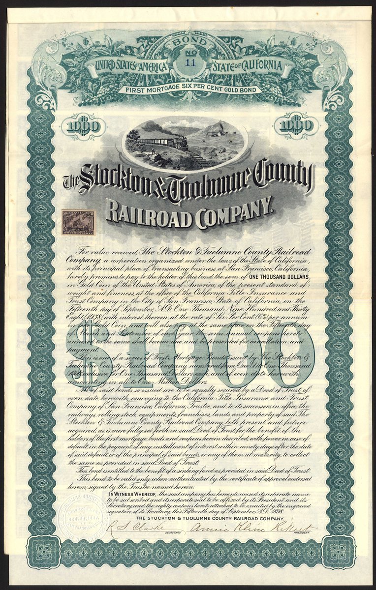 U.S.A.: Stockton & Toulumne County Railroad Co. (CA), first mortgage 6% gold bond for $1000, 1898, #11, train passing mine site at top, ornate border, green and black, with coupons. GVF.