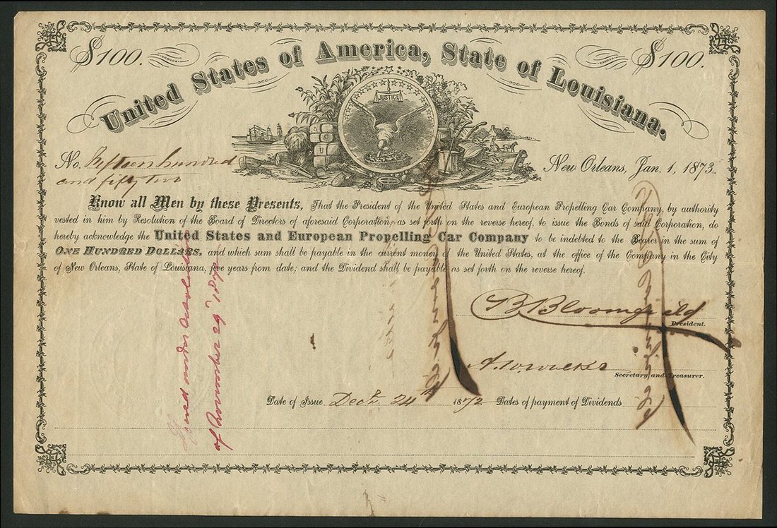 U.S.A.: United States and European Propelling Car Company, Louisiana, $100 bond, New Orleans 1873, #1552, state seal in centre, black. Ink burnt signatures on the reverse so quite fragile, toned, VF.