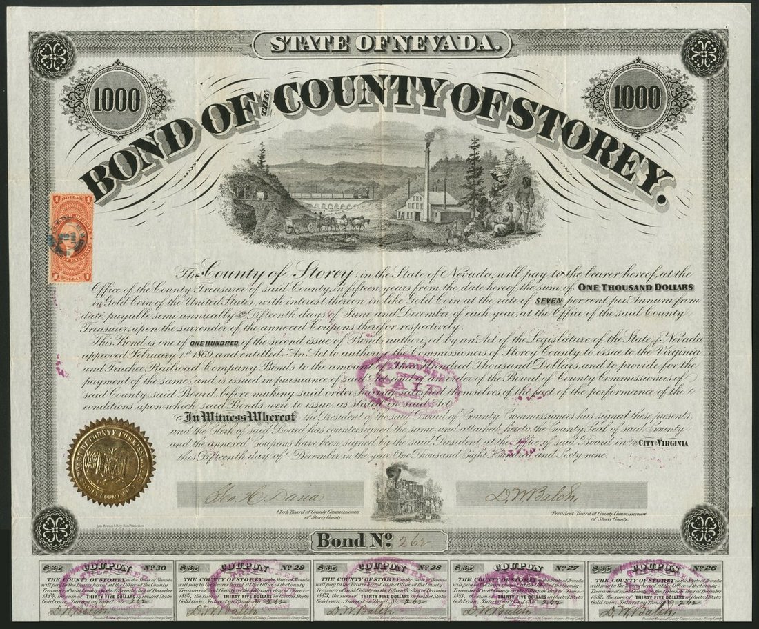 (x) U.S.A.: Nevada: County of Storey, 7% Loan, 1869, bond for $1000 issued in aid of the Virginia and Truckee Railroad Co., #262, of only 100 issued of this second issue, lovely vignette of mine entrance, smelting works and railroad in the distance, black, with coupons, cancelled. GVF and rare.