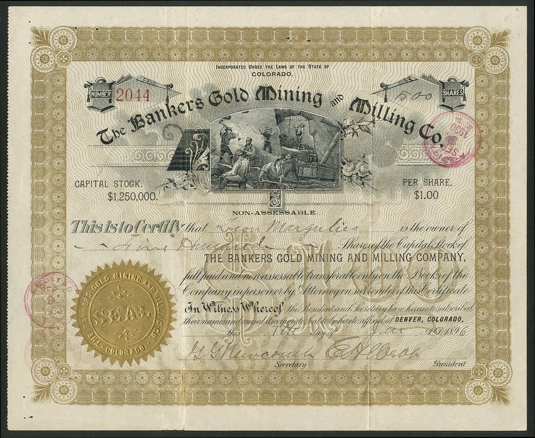 U.S.A.: Bankers Gold Mining and Milling Co., Colorado, $1 shares, Denver 189[6], #2044, miners at work, gold and black. Owned the Grouse, Star of Bethlehem, Shurtloff, Mollie We. and New Discovery claims on BUll Hill, Cripple Creek. A few pinholes, VF.