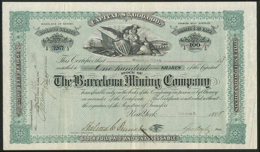 U.S.A.: Barcelona Mining Company, NY, 100 shares of $25, New York 188[8], #3267, American shield at top, green and black. Mines in the Spanish Belt District, Nye County Nevada. GVF.