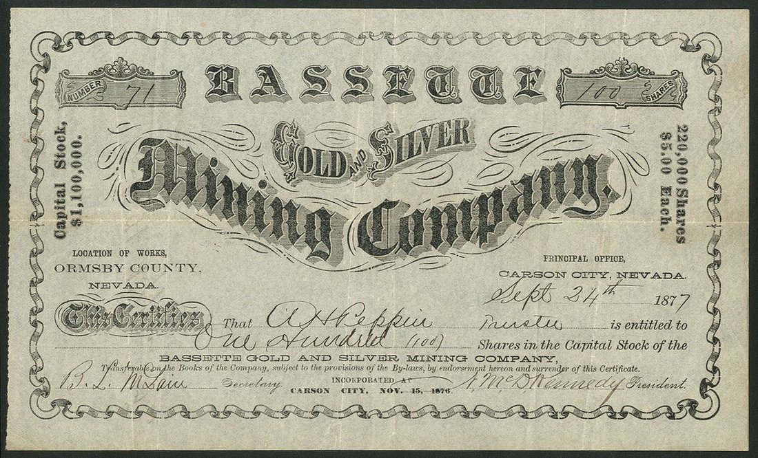 U.S.A.: Bassette Gold & Silver Mining Company, Nevada, $5 shares, Carson City 187[7], #71, attractive black printing. Mines in Ormsby County, Nevada. VF.