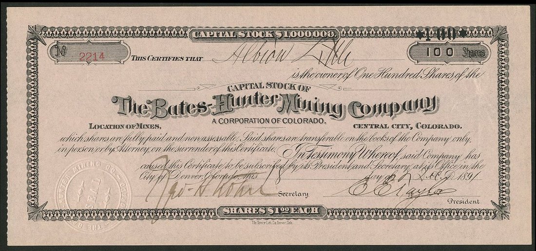 U.S.A.: Bates-Hunter Mining Company, Colorado, $1 shares, Denver 189[1], #2214, small format piece printed in black on pink paper. Central City Mining District, Gilpin County, Colorado. Still being worked by GS Mining Co. EF.