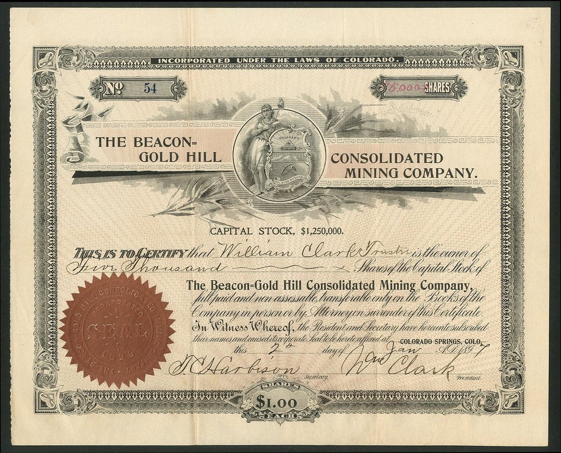 U.S.A.: Beacon - Gold Hill Consolidated Mining Company, Colorado, $1 shares, Colorado Springs 189[7], #54, State seal in centre, black, brown underprint and seal. GVF.