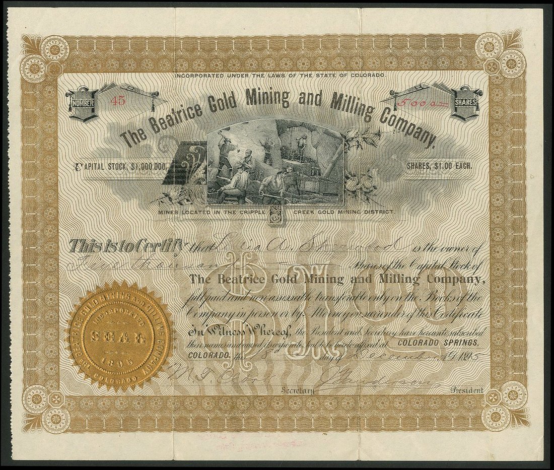 U.S.A.: Beatrice Gold Mining and Milling Company, Colorado, $1 shares, 189[5], #45, miners at work, gold and black. Owned the Ed. Dundon and Ironston mines in the Cripple Creek Mining District. Small repaired split on fold, VF.