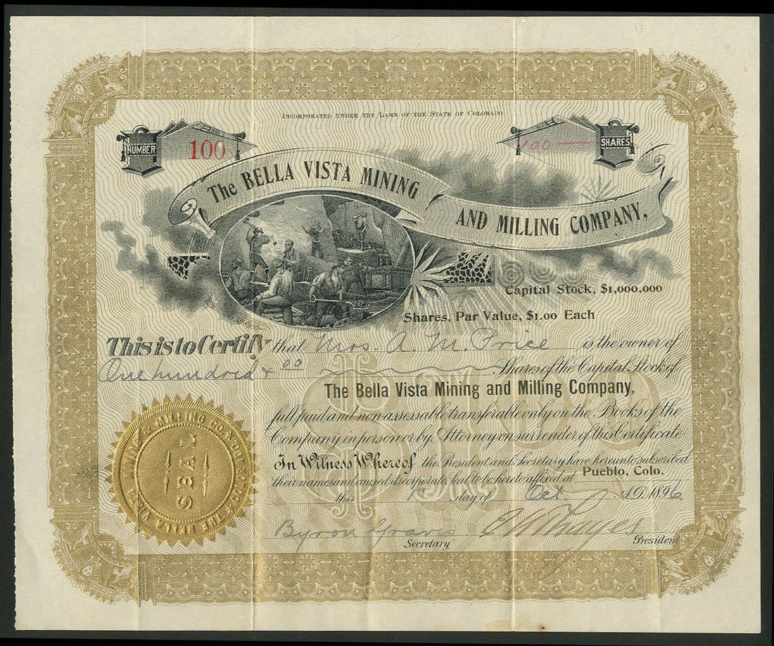 U.S.A.: Bella Vista Mining and Milling Company, Colorado, $1 shares, Pueblo 189[6], #100, miners at work underground, black and gold. Tiny rust mark bottom margin, GVF.