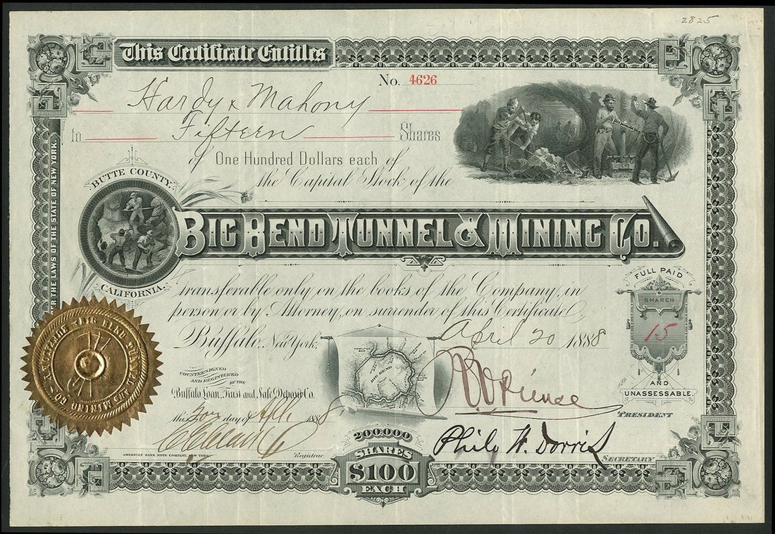 U.S.A.: Big Bend Tunnel & Mining Co., NY, $100 shares, Buffalo 188[8], #4626, 2 vignettes of miners, interesting map of Big Ben, Butte County, California, black, gold seal. VF.