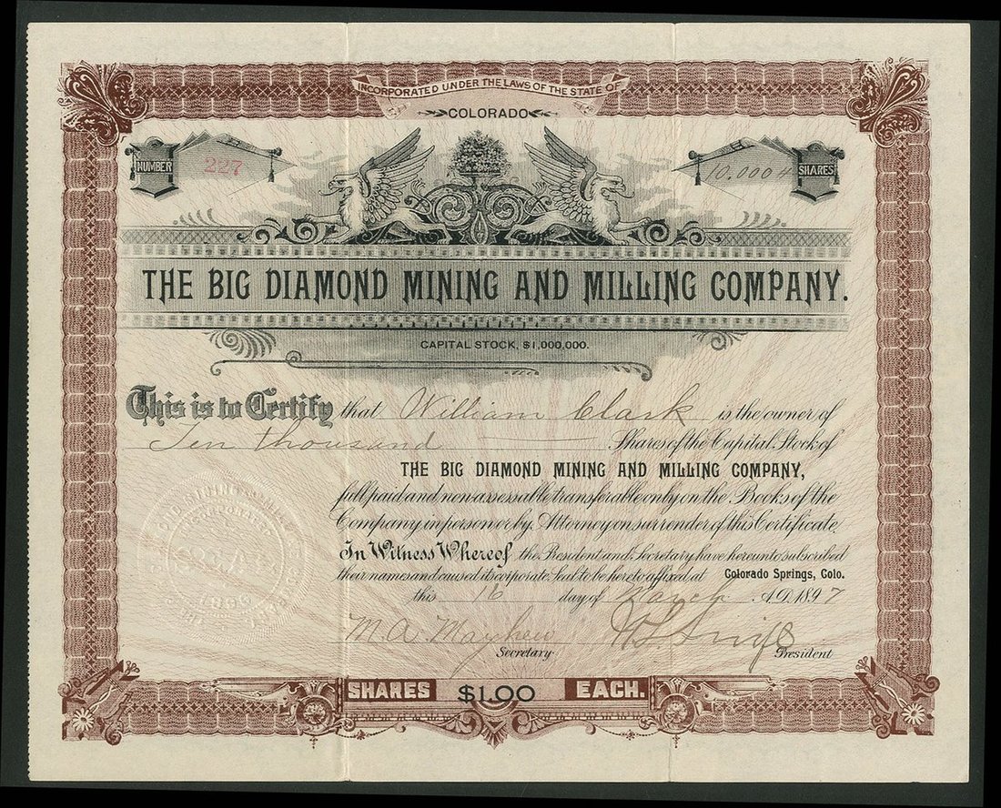 U.S.A.: Big Diamond Mining and Milling Company, Colorado, $1 shares, Colorado Springs 189[7], #227, brown and black. GVF.