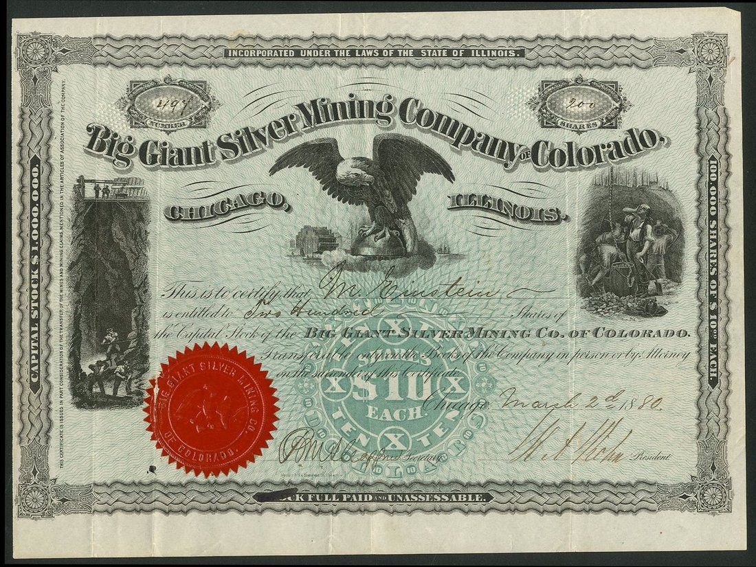U.S.A.: Big Giant Silver Mining Company of Colorado, Illinois, $10 shares, Chicago 18[80], #497, attractive piece with 2 vignettes of miners at work, eagle in centre, black, green underprint, red seal. VF.