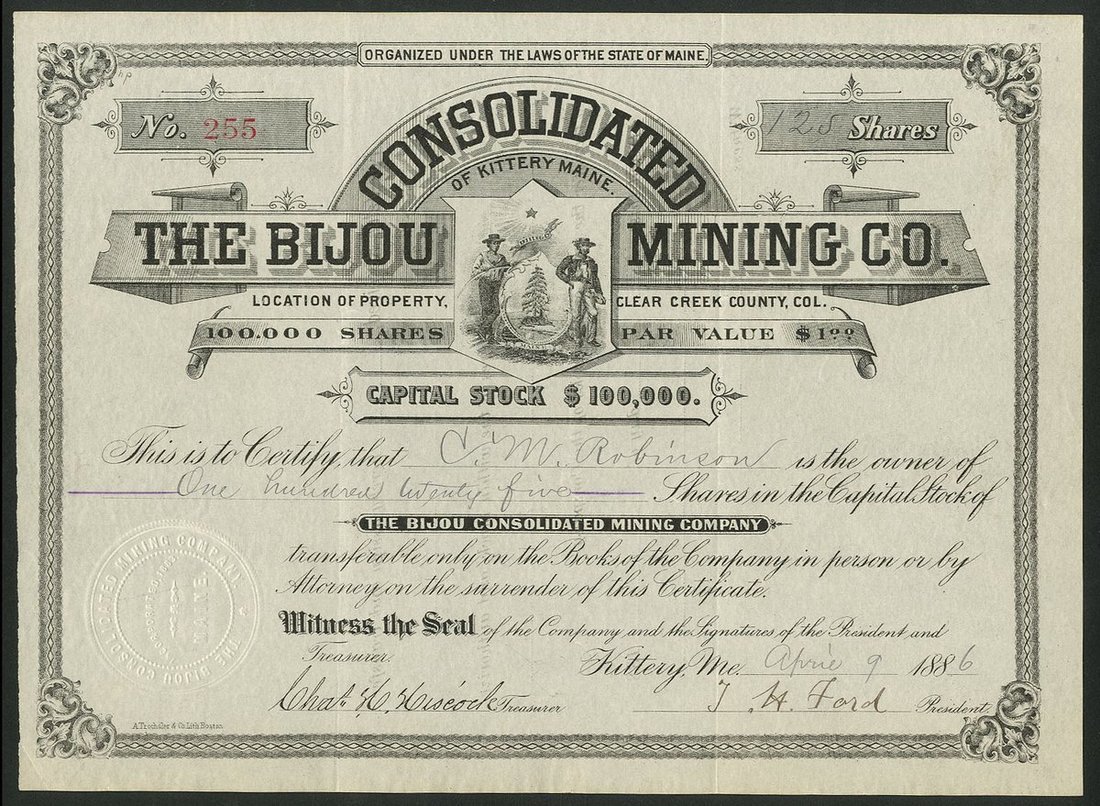 U.S.A.: Bijou Consolidated Mining Company of Kittery, Maine, $1 shares, 188[6], #255, Mine arms in centre, black. Mines in Clear Creek County, Colorado. GVF.