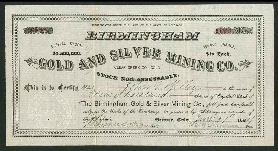 U.S.A.: Birmingham Gold and Silver Mining Co., Colorado, $10 shares, Denver 188[4], #545, black. Mines in Clear Creek County, Colorado. GVF.