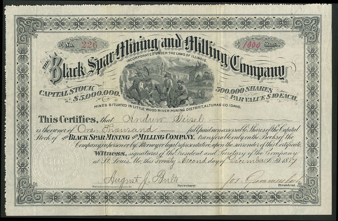 U.S.A.: Black Spar Mining and MIlling Company, Illinois, $10 shares, St.Louis 18[87], #226, miners at work above ground, black. Mines at the Little Wood River Mining District, Alturas County, Idaho. VF.