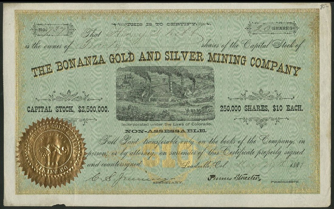 U.S.A.: Bonanza Gold and Silver Mining Company, Colorado, $10 shares, Leadville 188[2], #737, large building in centre, black and gold with blue underprint. Small chip out of bottom margin, VF.