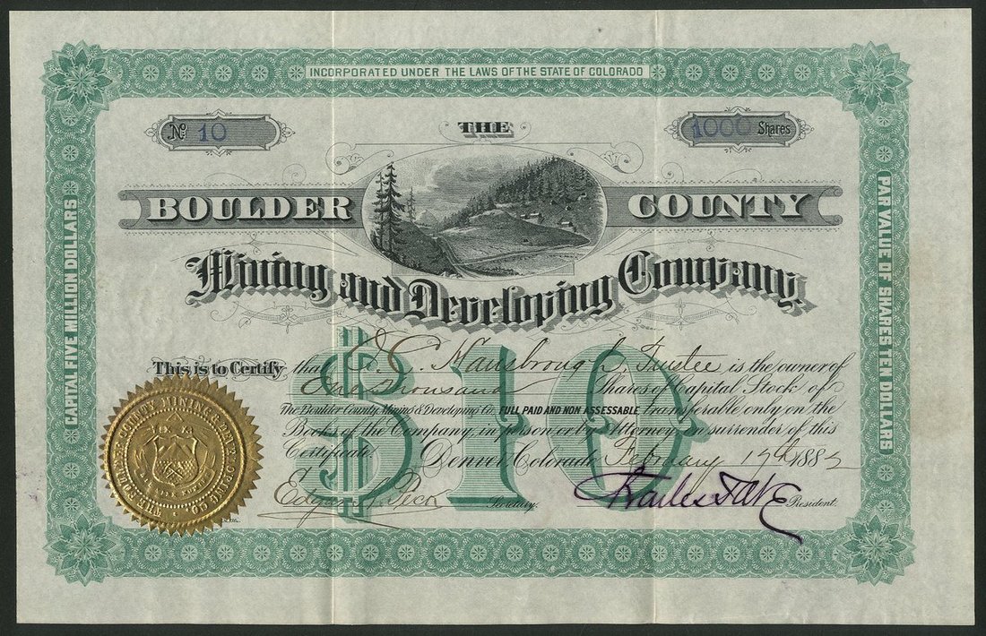 U.S.A.: Boulder County Mining and Developing Company, Colorado, $10 shares, Denver 188[2], #10, attractive piece with mining camp in centre, green and black, gold seal. GVF and rare.