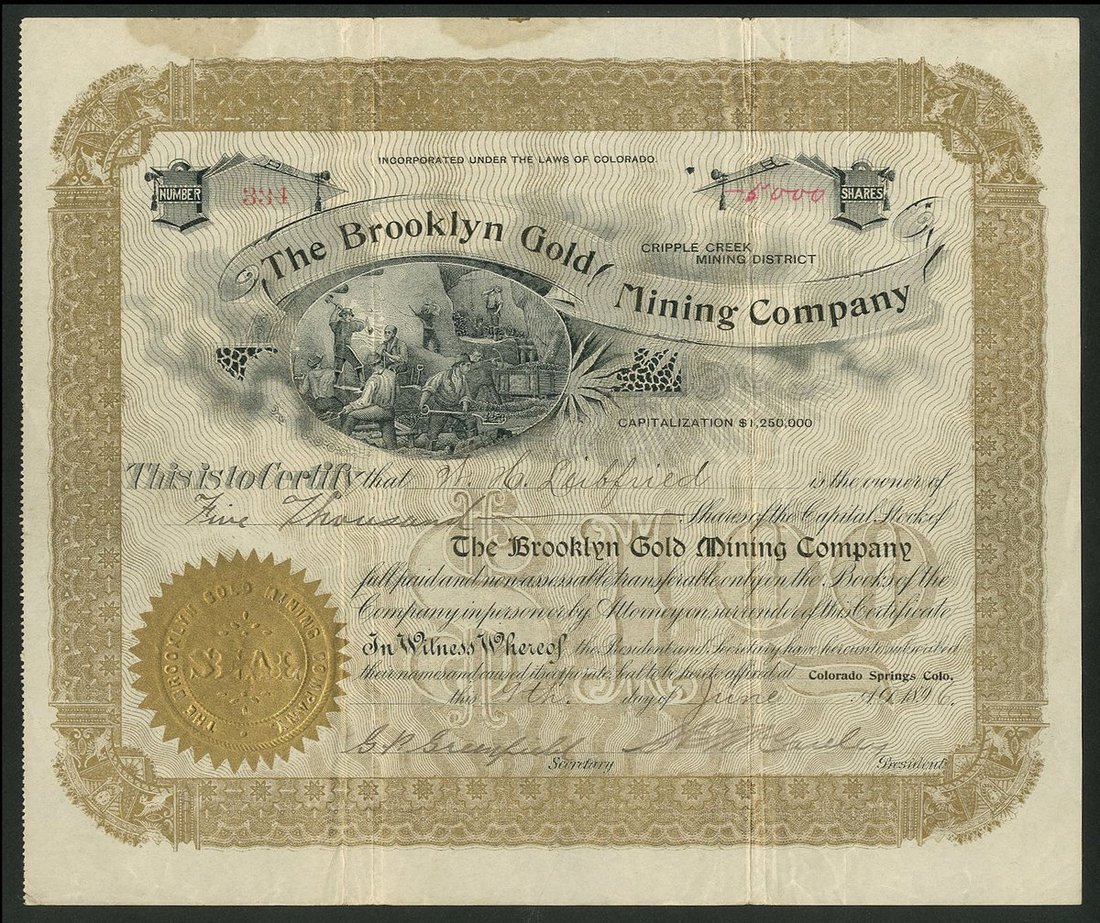 U.S.A.: Brooklyn Gold Mining Company, Colorado, [5000] shares, Colorado Springs 189[6], #334, miners at work, gold and black. Mines in the Cripple Creek Mining District. Minor staining in top margin, AVF.