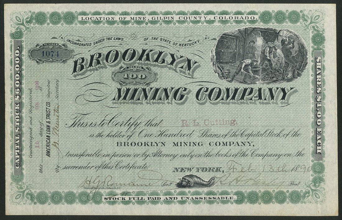 U.S.A.: Brooklyn Mining Company, Kentucky, $1 shares, New York 18[90], #1074, miners at work top right, black and green. Mine in Gilpin County, Colorado. EF.
