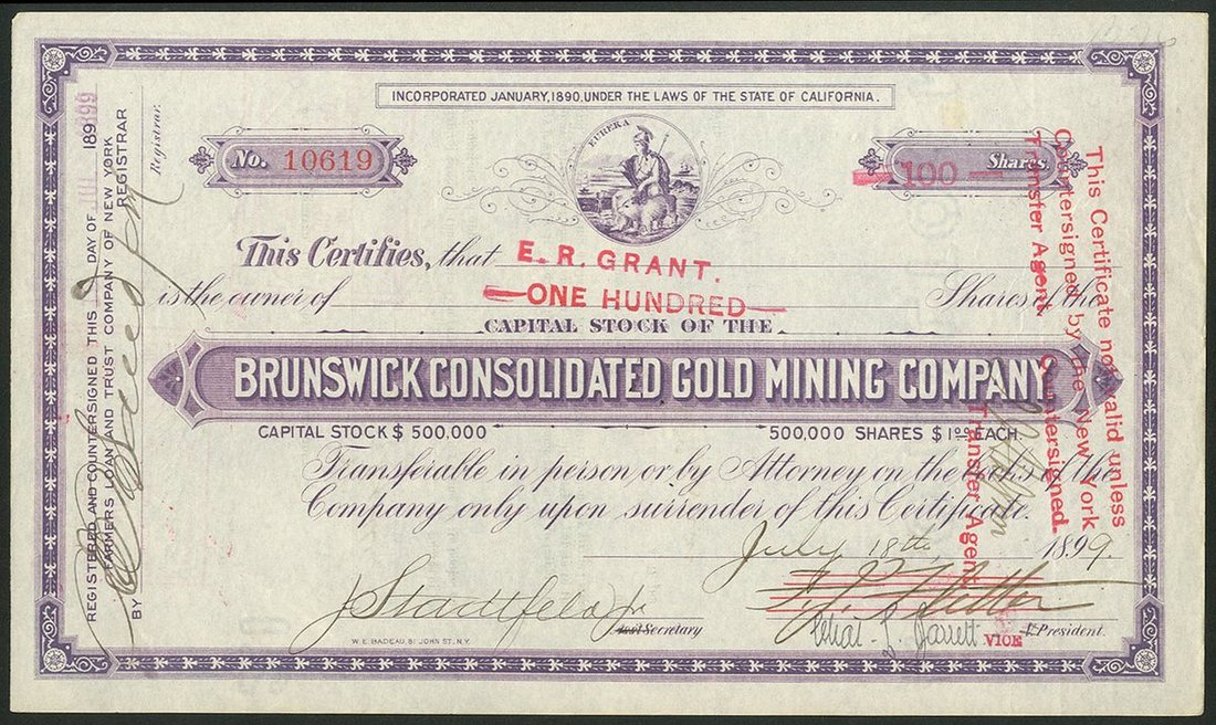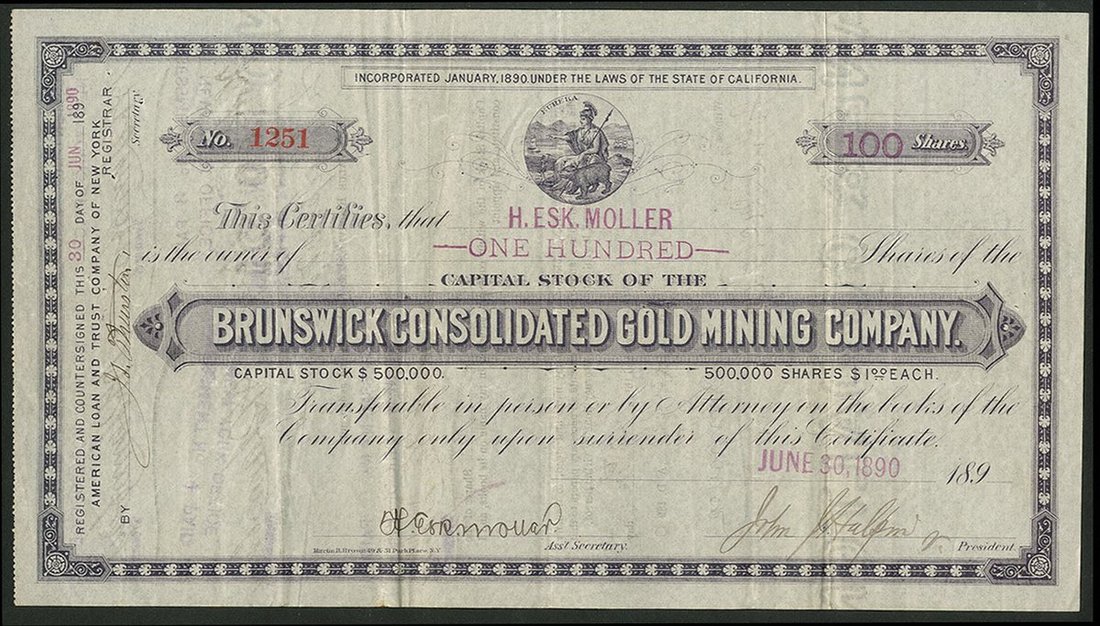 U.S.A.: Brunswick Consolidated Gold Mining Company, California, pair of certificates for $1 shares, 189[0], #1251 and 189[9], #10619, State seal at top, mauve, the first printed by Martin B. Brown and the second by W.E.Badeau, different registrars and other minor differences. VF and EF (2).