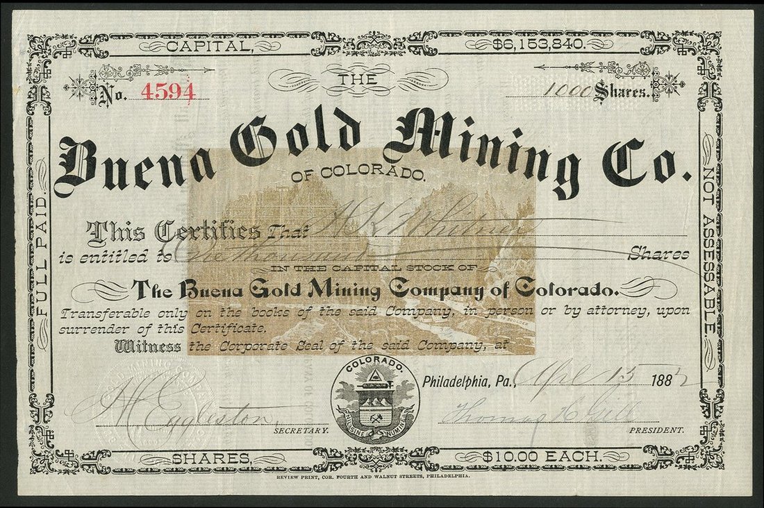 U.S.A.: Buena Gold Mining Company of Colorado, $10 shares, Philadelphia 188[2], #4594, brown underprint vignette of mining camp, black text. GVF.