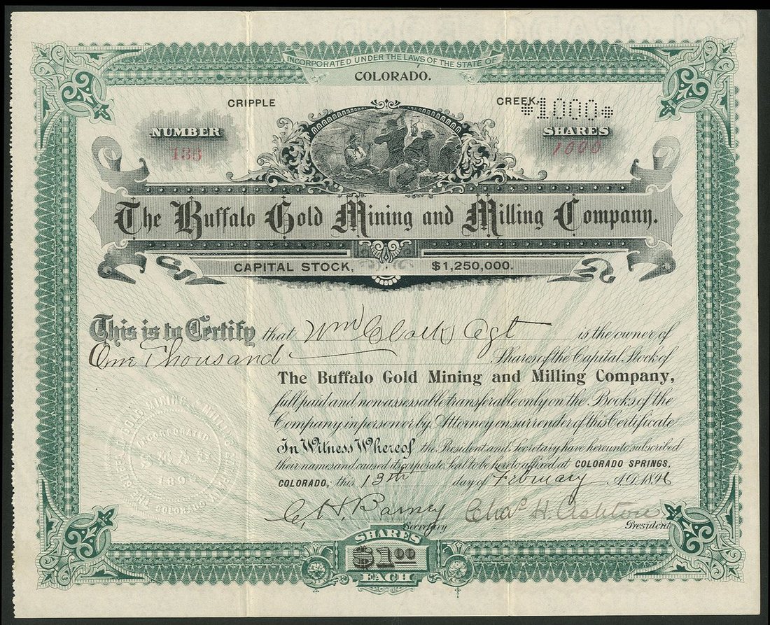 U.S.A.: Buffalo Gold Mining and Milling Company, Colorado, $1 shares, Colorado Springs 189[6], #136, miners at work top centre, green and black. Mines in the Cripple Creek District. GVF.