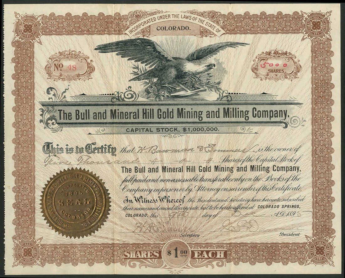 U.S.A.: Bull and Mineral Hill Gold Mining and Milling Company, Colorado, $1 shares, Colorado Springs 189[5], #48, eagle at top, brown and black, gold seal. GVF.
