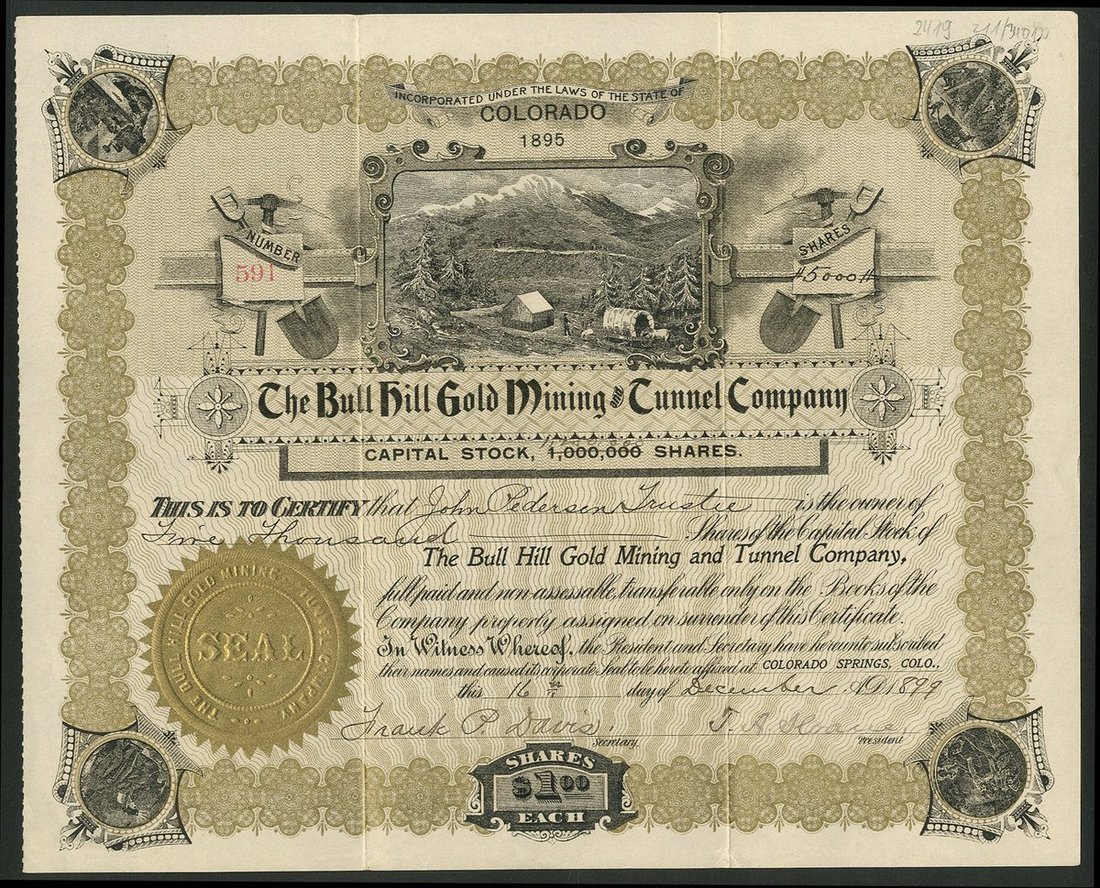 U.S.A.: Bull Hill Gold Mining and Tunnel Company, Colorado, $1 shares, Colorado Springs 1[899], #591, lovely vignette of mining camp, gold and black. GVF.